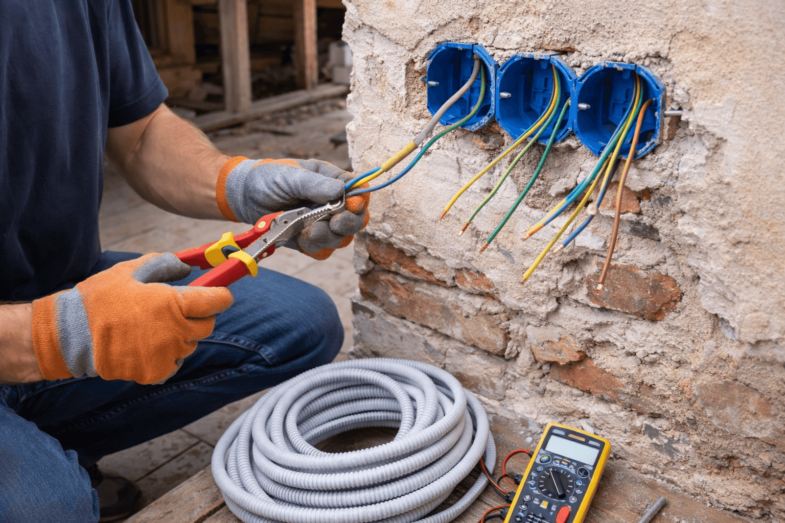 Först stängs strömmen av, och den gamla elen tas bort. Sen drar elektrikern nya kablar som klarar dagens krav och behov. Hur jobbet görs beror lite på hur huset är byggt – det kan vara träväggar, betong eller gamla lösningar som kräver extra anpassning.